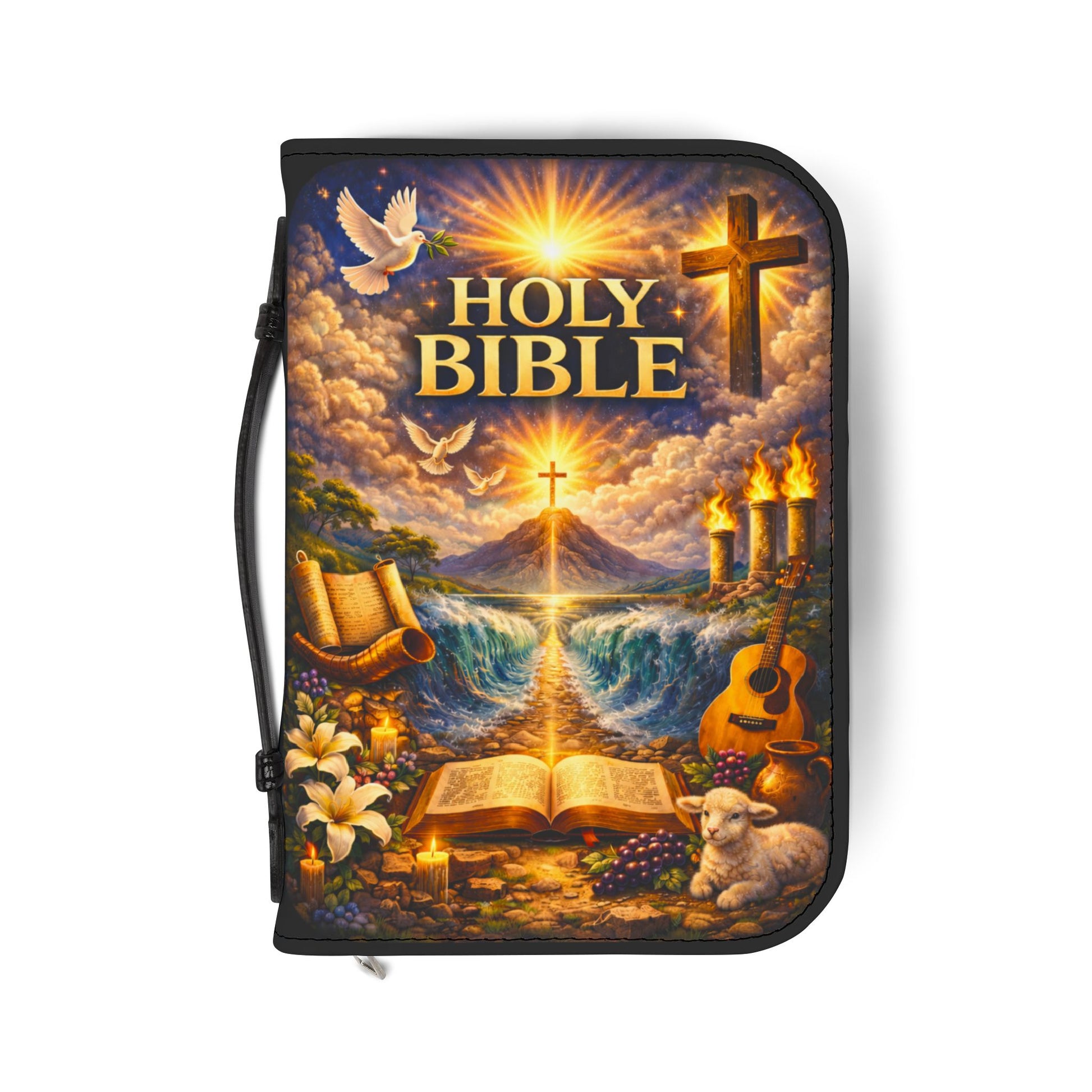 This PU leather Bible cover brings warmth and reverence to every reading moment. The vibrant illustrated front features a radiant sunrise, cross, doves and symbolic imagery that draws the eye and invites reflection. A padded zipper closure keeps pages safe, while internal compartments hold pens, notes, and small devotional items. The black handle and trim give it a grounded, travel-ready look so it moves easily from pew to coffee shop to bedside. Choose a size for your Bible and carry a protective, beautifully designed cover that encourages daily reading and quiet moments of gratitude.