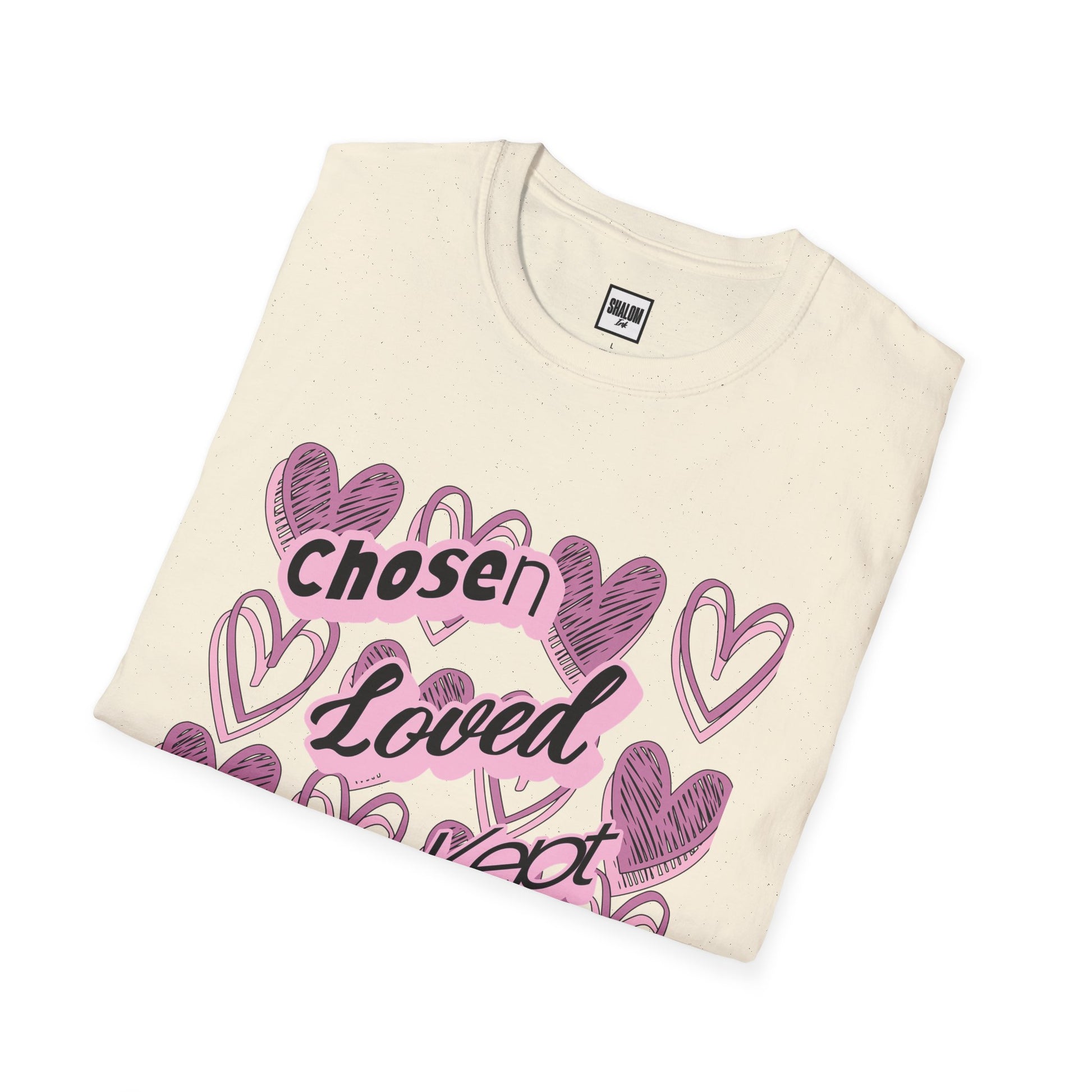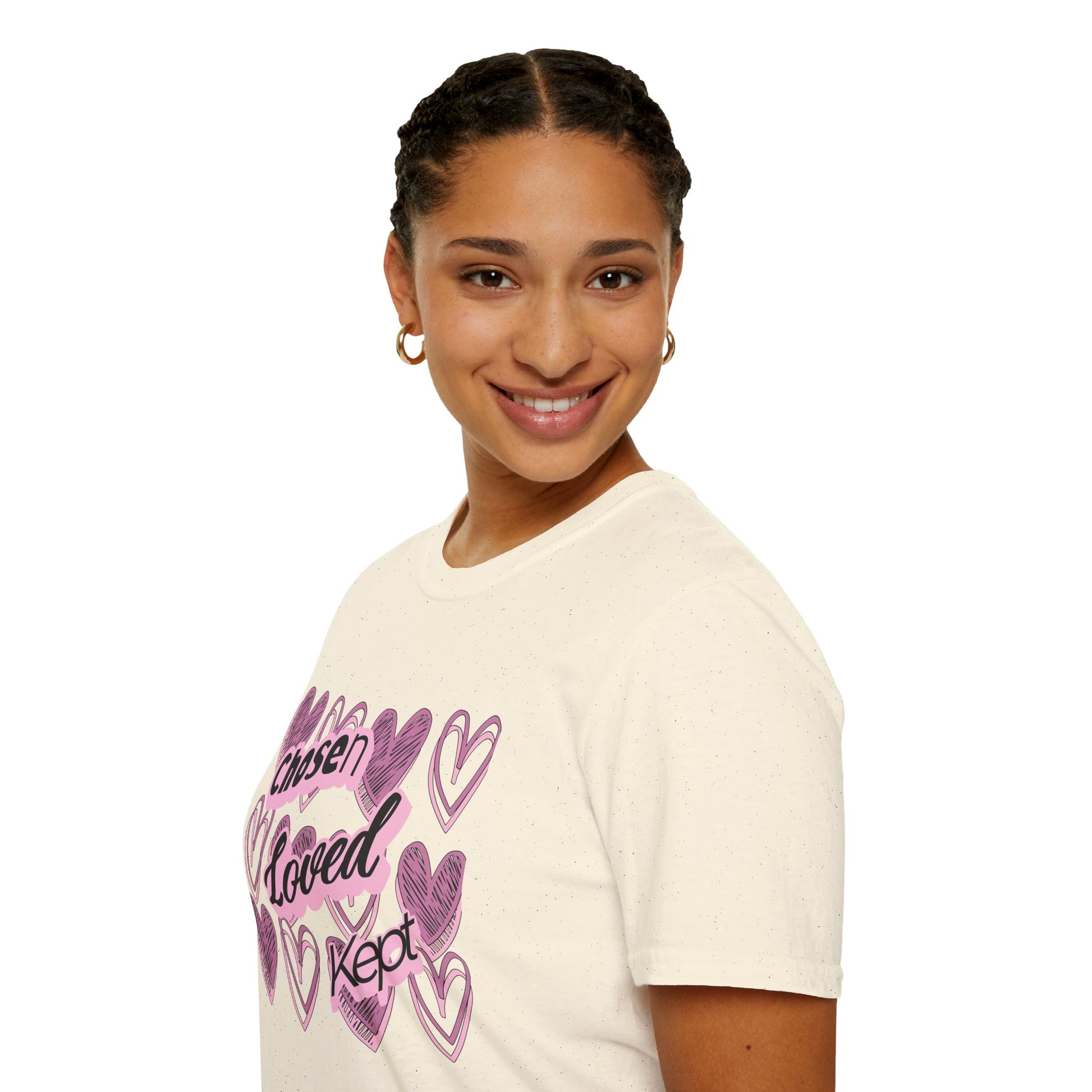 Soft, simple, and quietly uplifting, this lightweight tee carries a gentle message wrapped in hand-drawn hearts. Chosen. Loved. Kept. reads like a personal reminder—rooted in identity, belonging, and the assurance that we are held by God’s love.